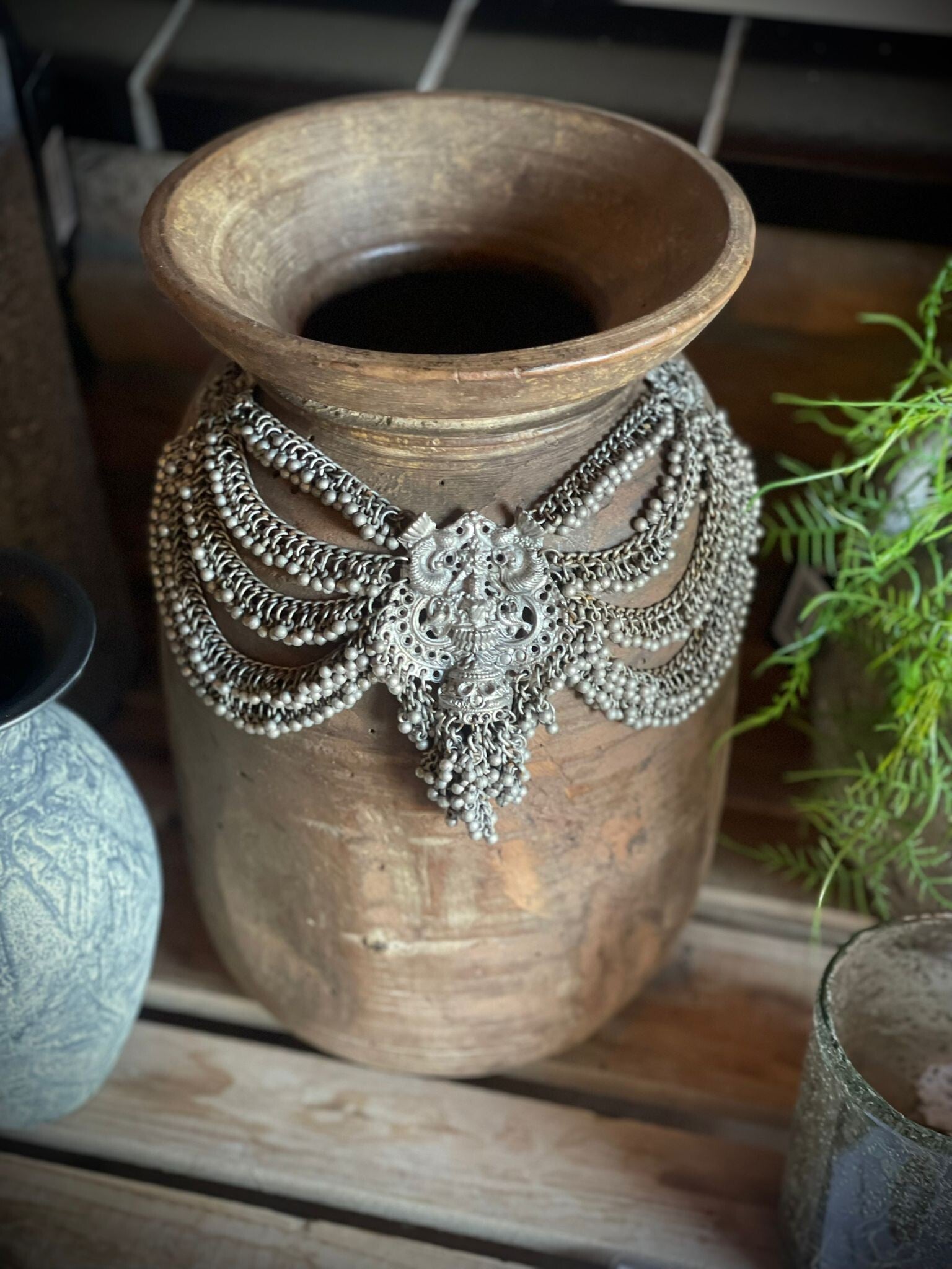 Een prachtige houten kruik uit Nepal, met een warme authentieke uitstraling. Deze stoere kruik werd gebruikt in Nepal om water op het hoofd te dragen. Het verweerde hout en de robuuste vormen maken iedere kruik uniek!