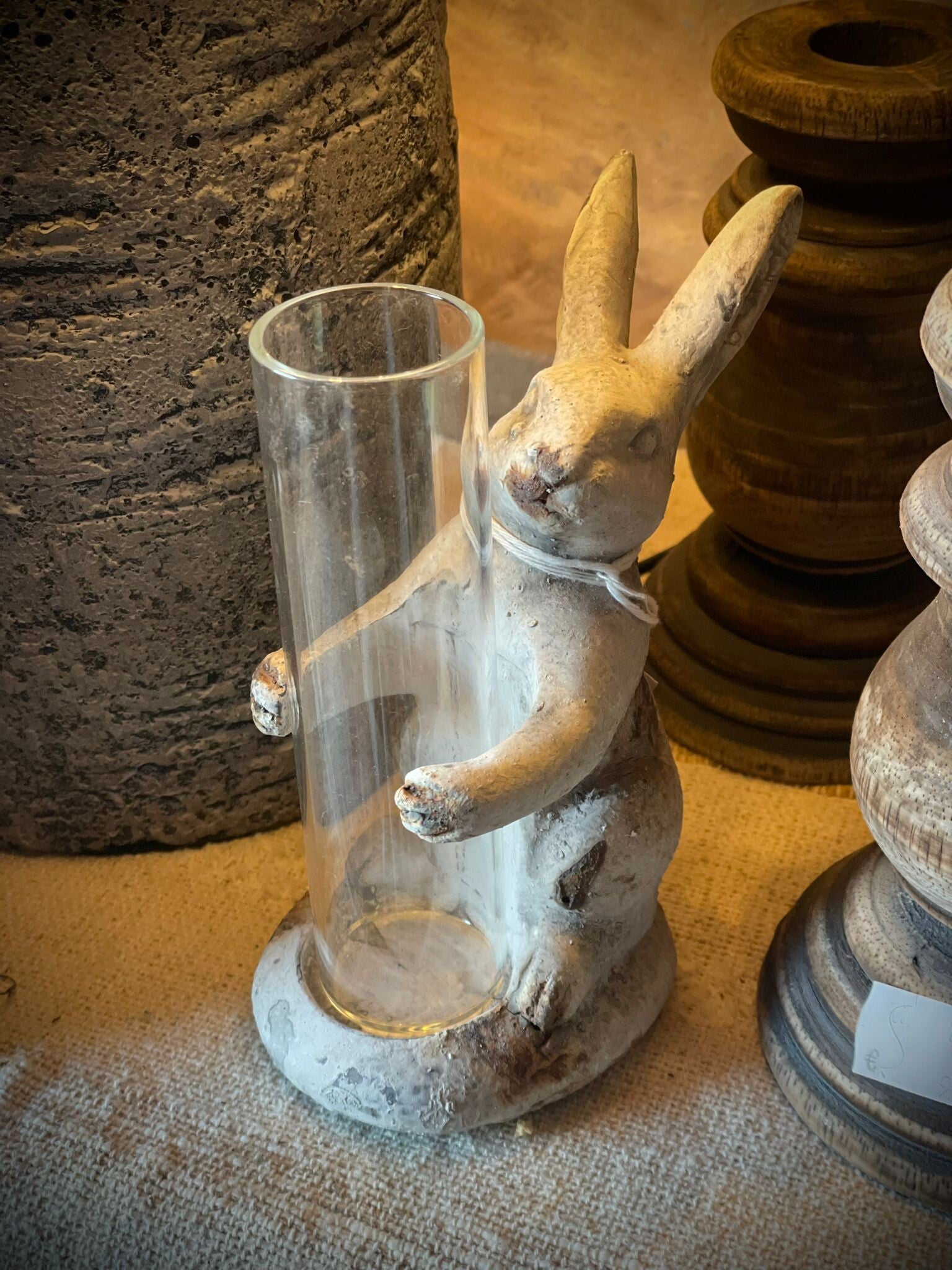 Stenen konijn met vaasje.